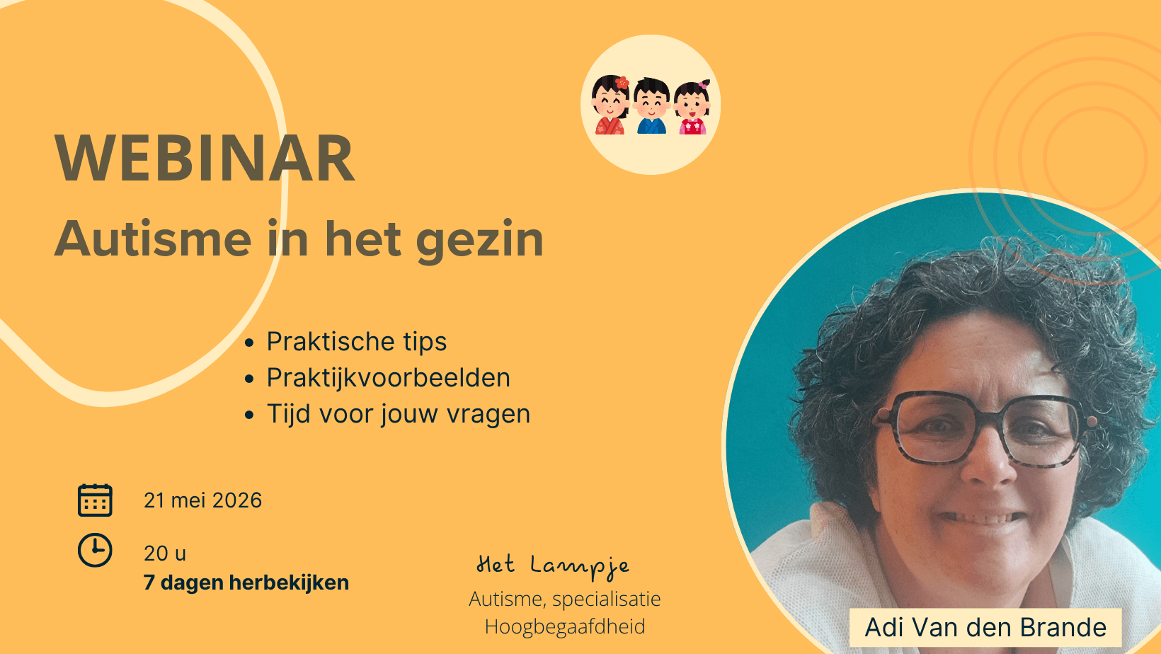 Ik heb een heel aantal webinars gevolgd bij Het Lampje, evenals de cursus 'Autisme in je kind' herkennen. Deze volgde ik online. Er waren meer dan voldoende oefenmomenten en vragenuurtjes om vragen te kunnen stellen en de inzichten praktisch te gaan toepassen. Ik had ook een telefonisch adviesgesprek met Adi zelf, zij heeft mij handvaten gegeven om weer verder te kunnen. Adi heeft tonnen expertise in een specifiek vakgebied. Wij zijn zelf niet van regio Leuven maar ik kom steeds bij haar terecht omdat ik hier in onze regio niemand vindt met dezelfde expertise. Ik kan Het Lampje zeker aanbevelen.